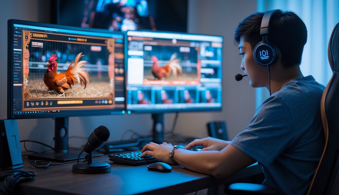 Seseorang duduk di meja dengan beberapa monitor yang menampilkan pertandingan sabung ayam secara langsung, menggunakan headphone dan mikrofon di ruang kerja yang terang.